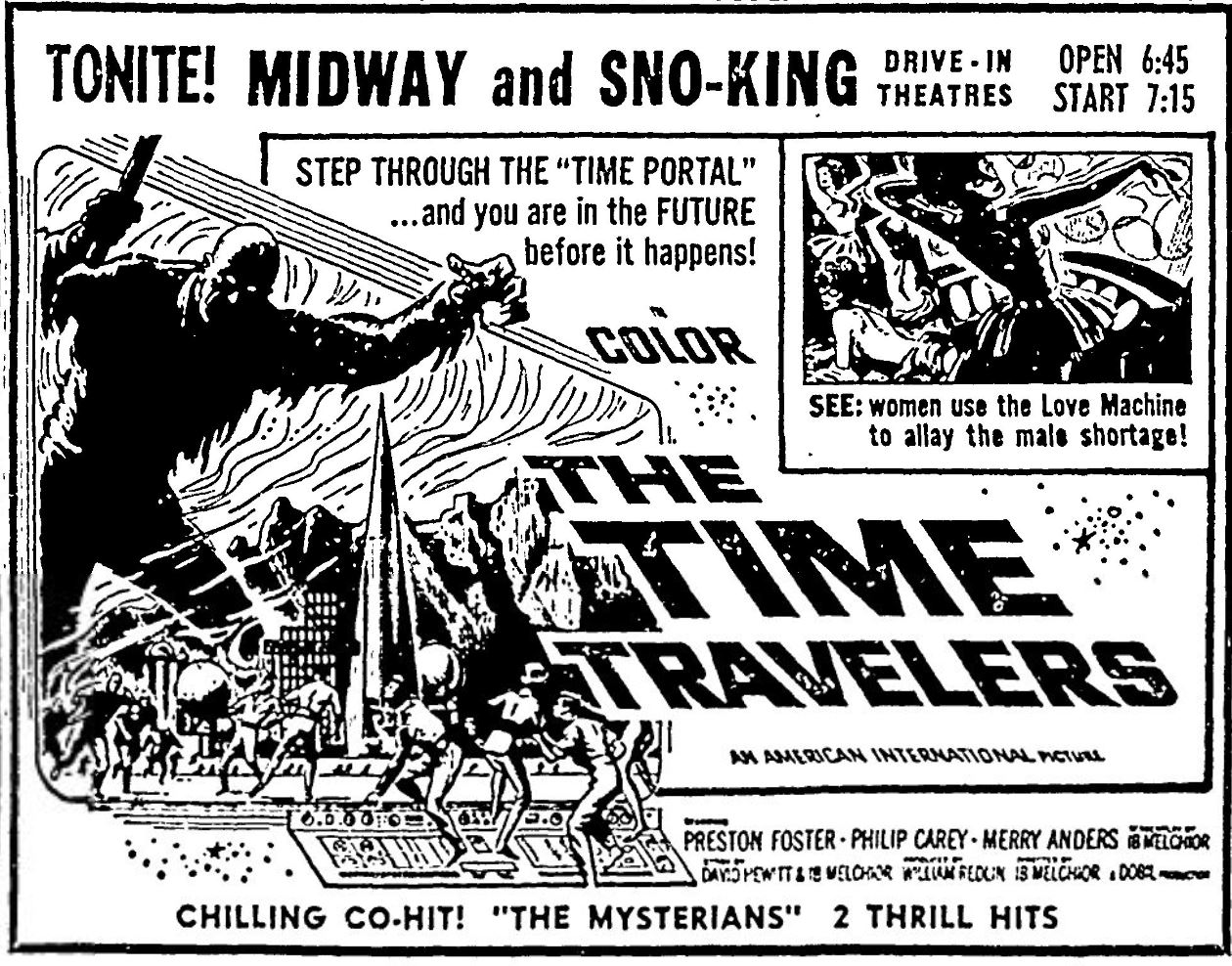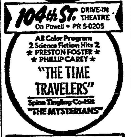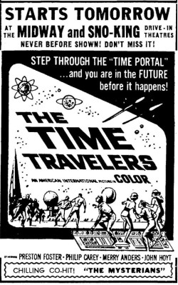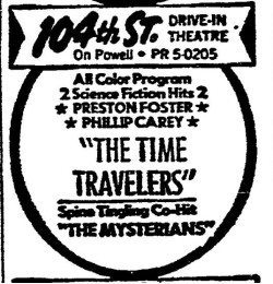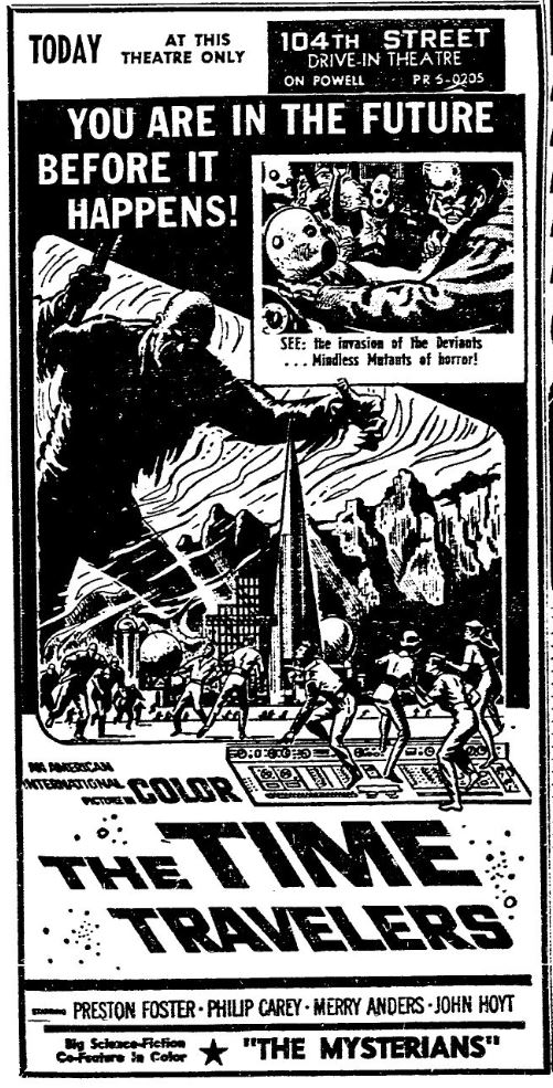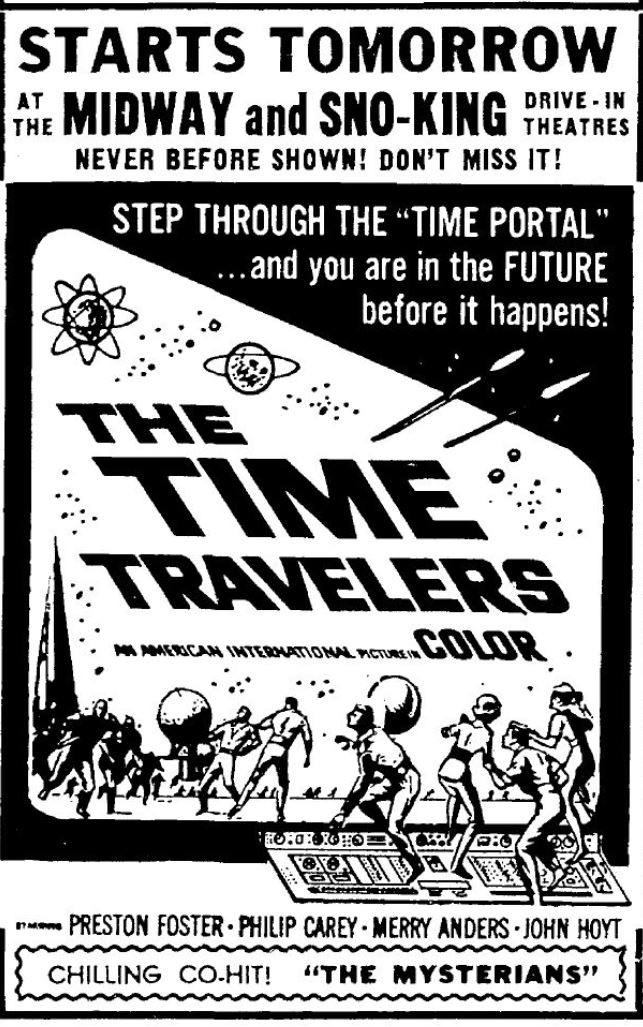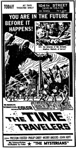 This is a collection of media from the initial runs of "The Time Travelers" (1964) in the Pacific Northwest. "The Mysterians" (1957) was the co-feature. This film had the shortest run of ad support I have seen for an AIP title thus far.