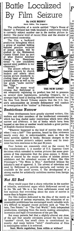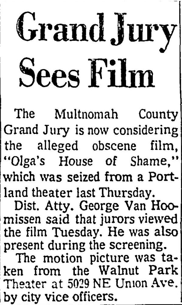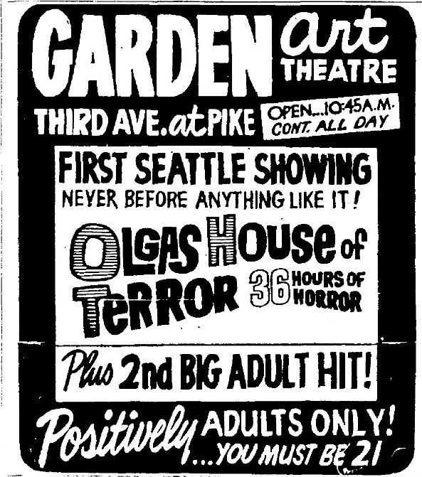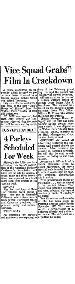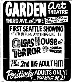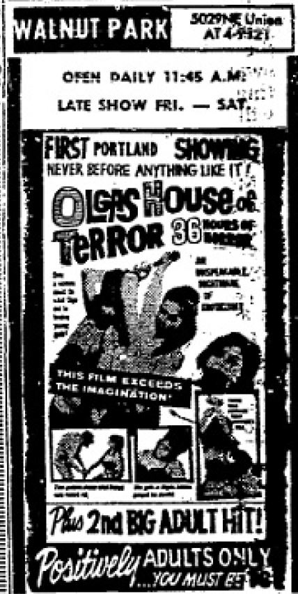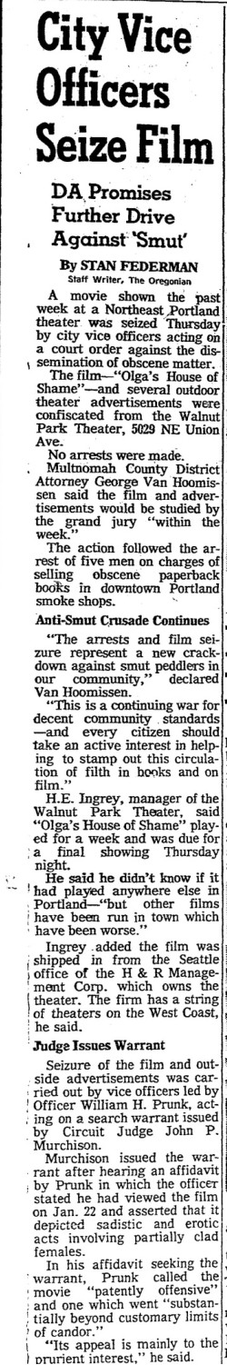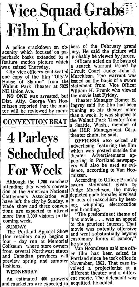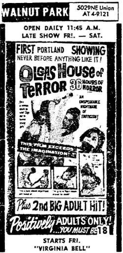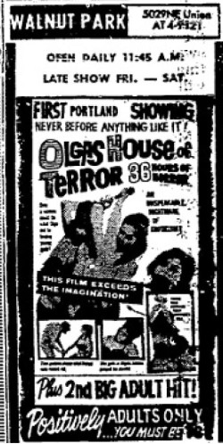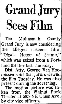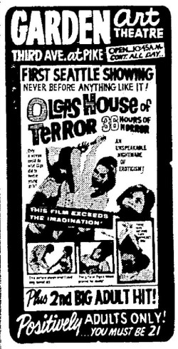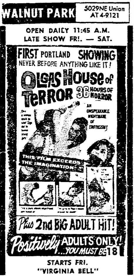 This is a collection of media from the initial runs of "Olga's House of Shame" (1964) in the Pacific Northwest. It appeared here as "Olga's House of Terror" for some reason. This earlier "roughie" was actually seized by the Portland vice squad, so I have included a few articles on that. If interested, we have an article on the US Congress and cinematic nudity here.