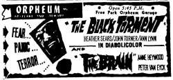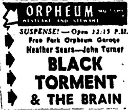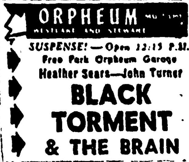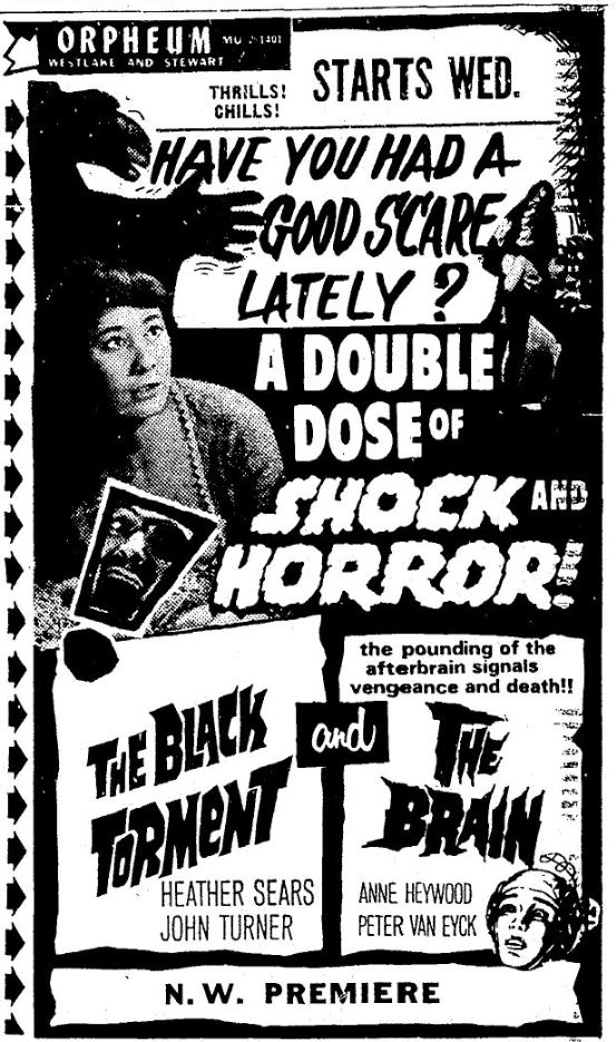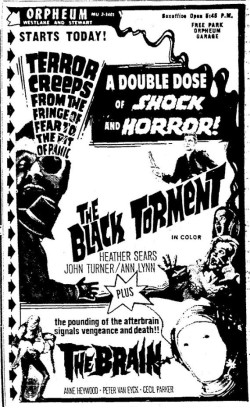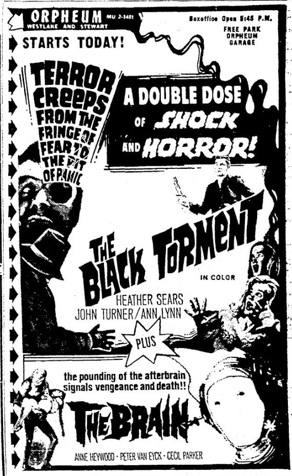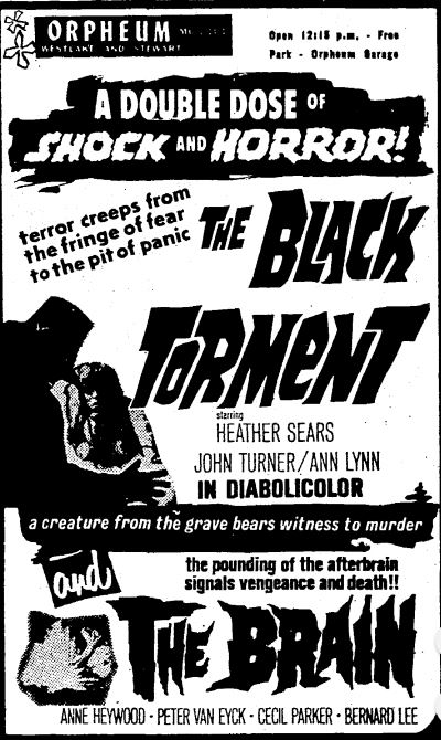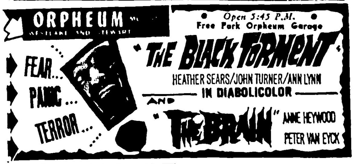 This is a collection of media from the initial runs of "The Black Torment" (1964) in the Pacific Northwest. 1962's "The Brain" also appeared for the first time in the PNW on this bill. "The Black Torment" wouldn't be seen in Portland until 1966 on the bottom half of a bill with mondo movie "Macabro" (1966). Portland never got "The Brain."
