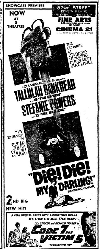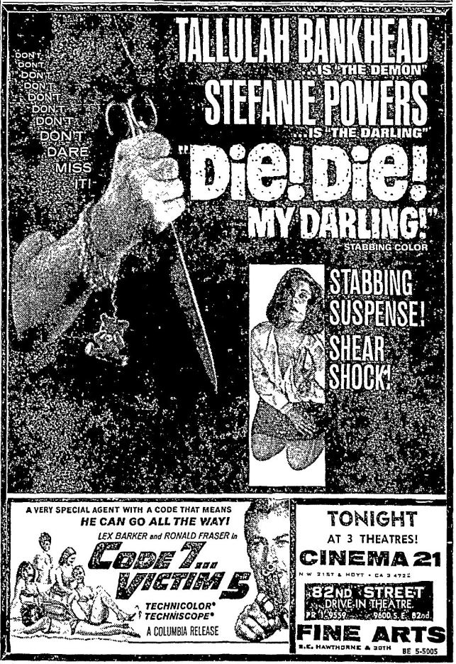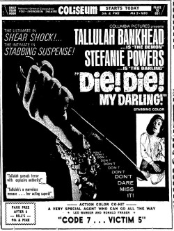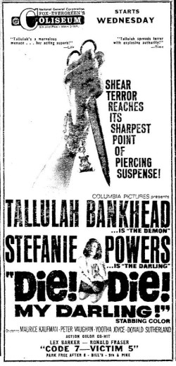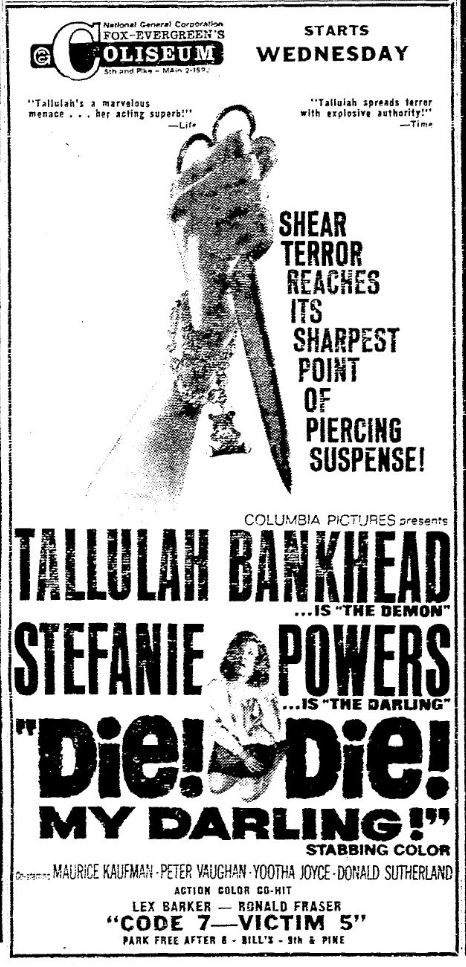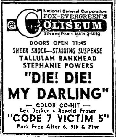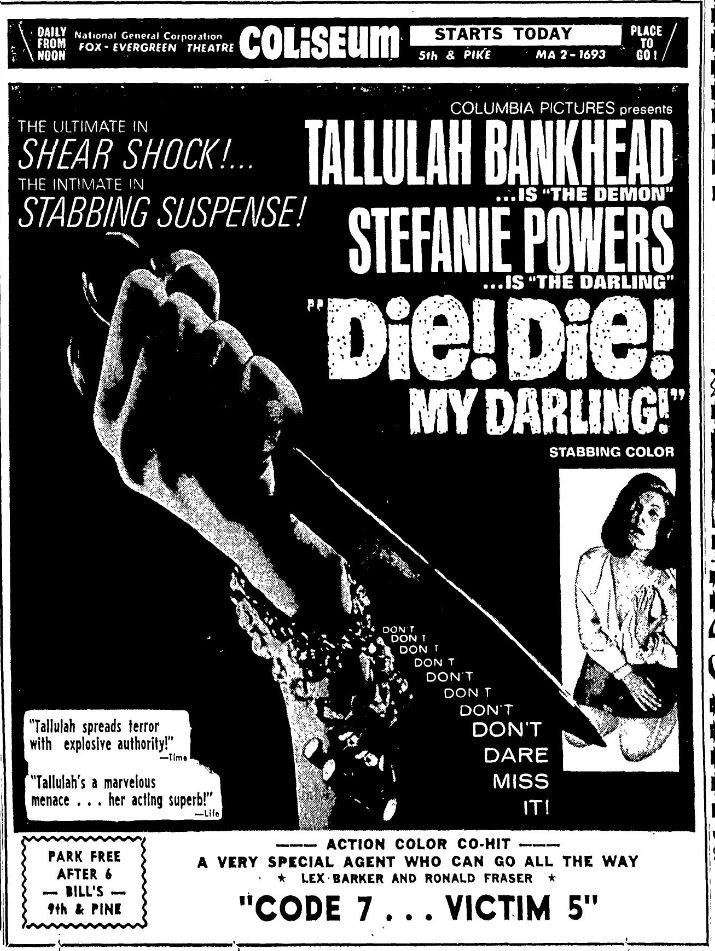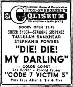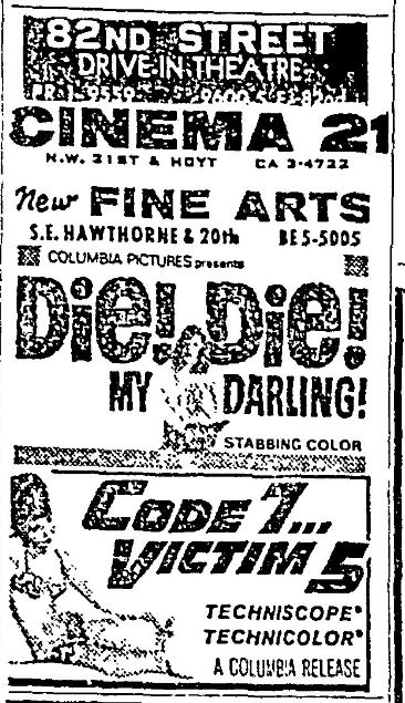 This is a collection of media from the initial runs of "Die! Die! My Darling!" (1965) in the Pacific Northwest.