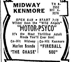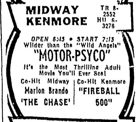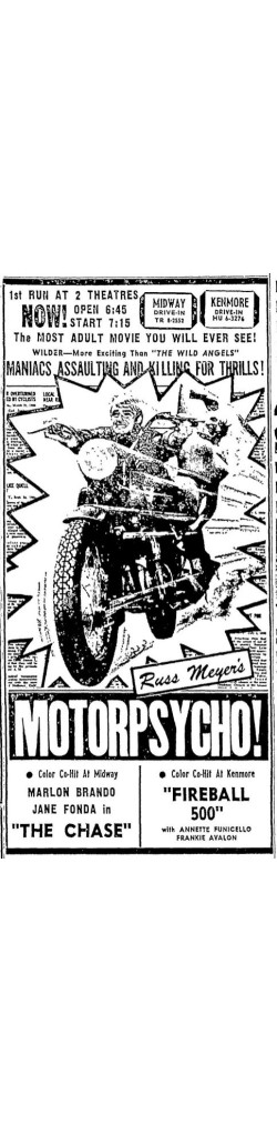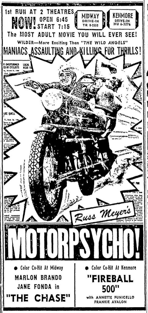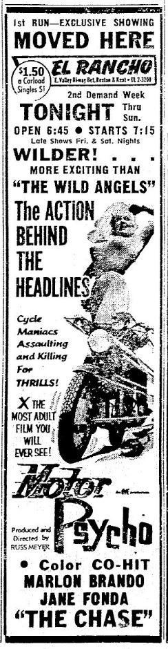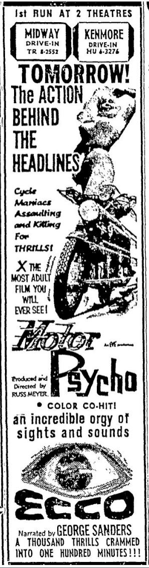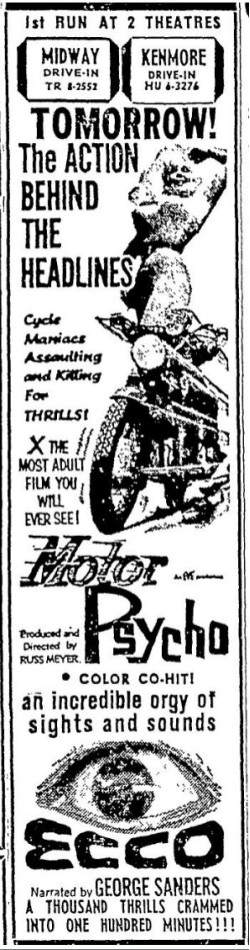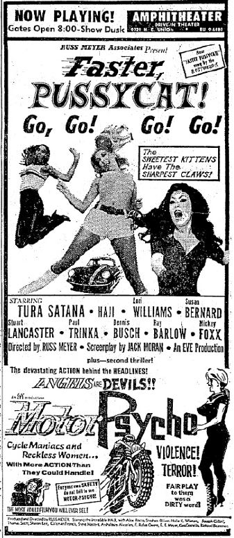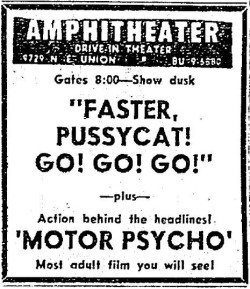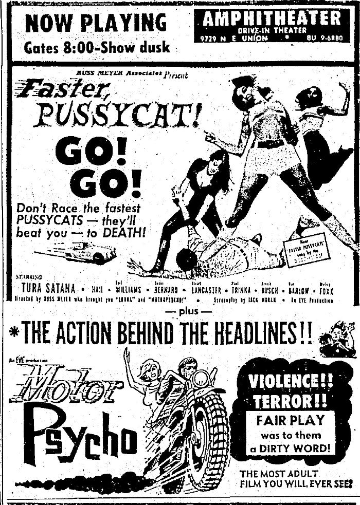 This is a collection of media from the initial runs of "Faster, Pussycat! Kill! Kill!" and "Motorpsycho!" (1966) in the Pacific Northwest. "Faster..." doesn't seem to have made its way to Seattle until revival screenings decades later. At least "THE MOST ADULT FILM YOU WILL EVER SEE" played in Seattle. Interestingly, the original "Faster, Pussycat! Kill! Kill!" title was too much for Portland media!