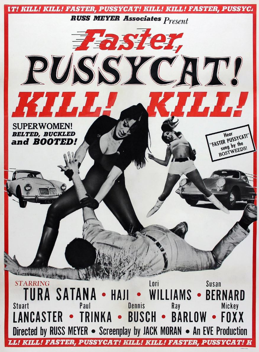 “Faster, Pussycat! Kill! Kill!” is a 1966 cult classic directed by Russ Meyer. The film follows three fierce and rebellious go-go dancers—Varla, Rosie, and Billie—who embark on a wild and violent adventure through the California desert. High-speed car chases, intense confrontations, and criminal escapades mark their journey. As they encounter various characters along the way, their actions lead to unexpected twists and turns. The film is renowned for its bold portrayal of strong female characters, its provocative themes, and its unique blend of action and exploitation cinema. Despite its initial reception, it has gained a significant following and is celebrated for its influence on pop culture and its unapologetic style.