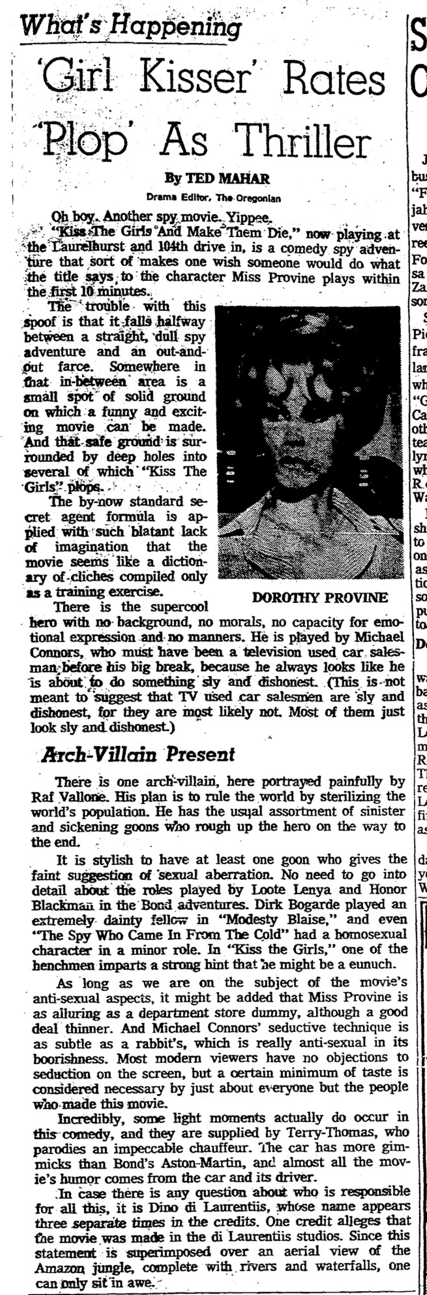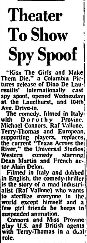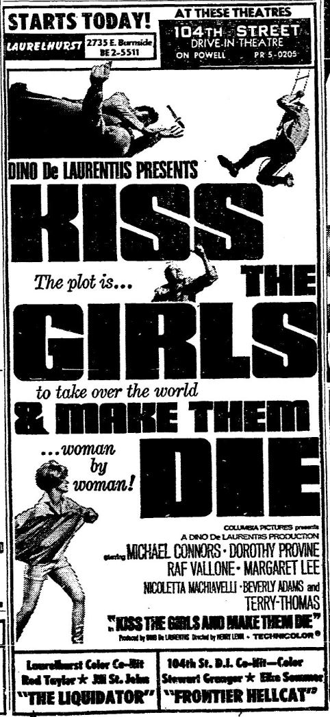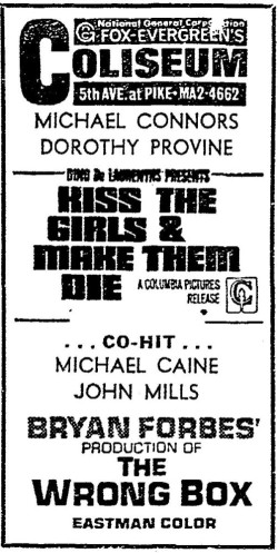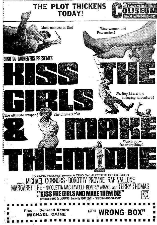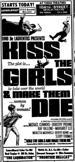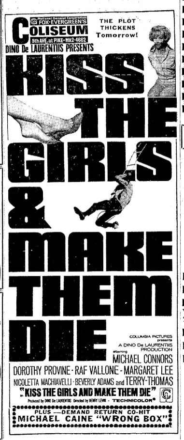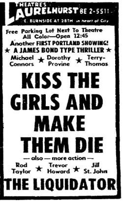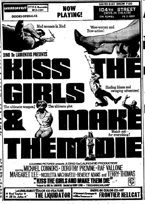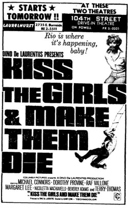 This is a collection of media from the initial runs of "Kiss the Girls and Make Them Die" (1966) in the Pacific Northwest.