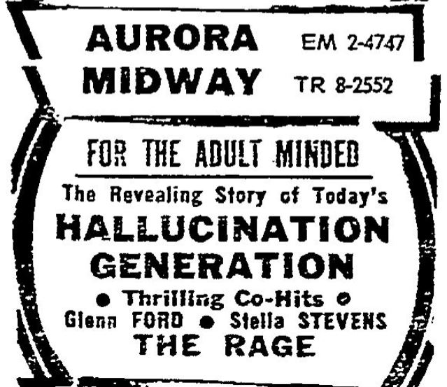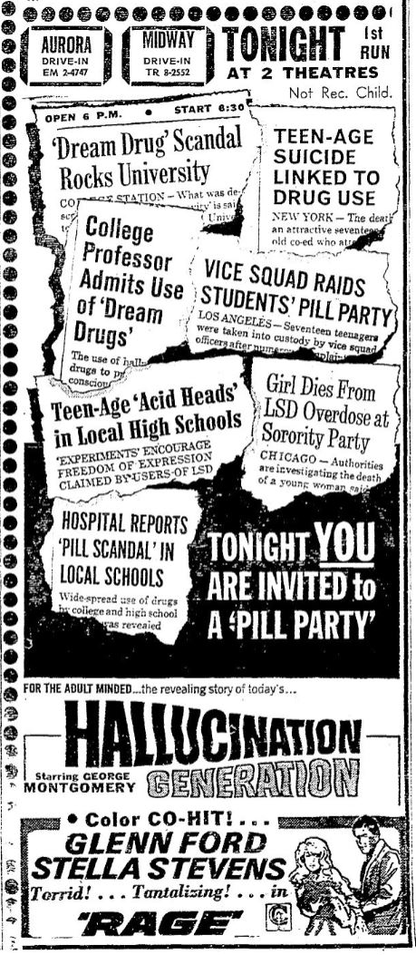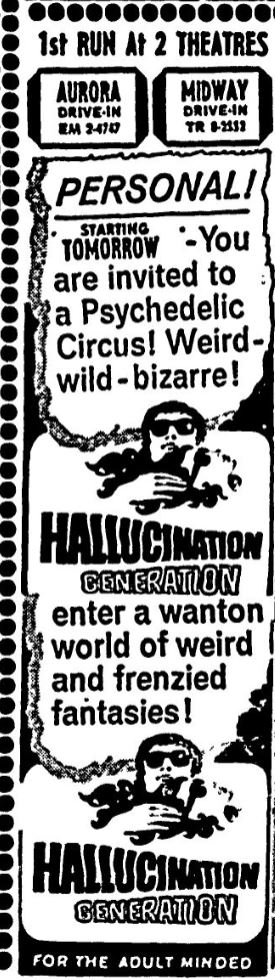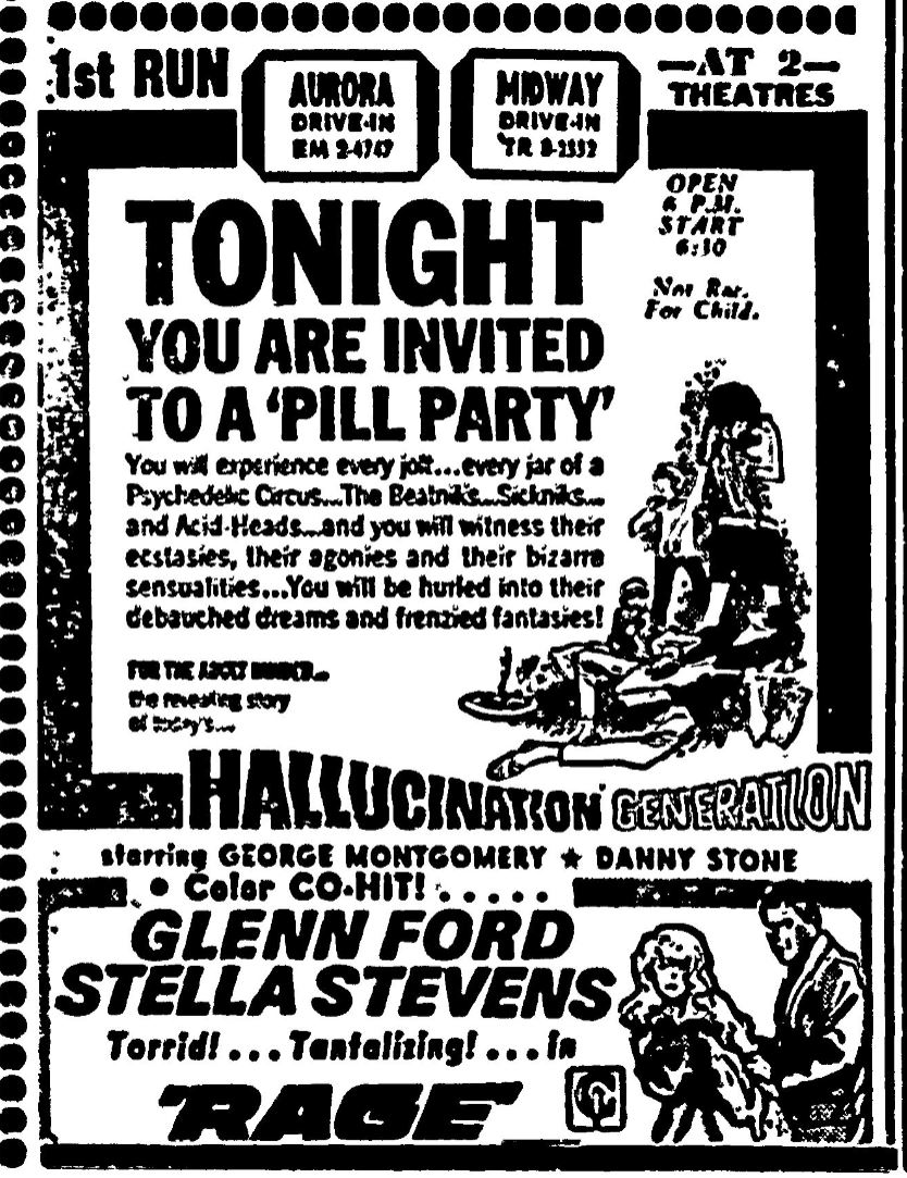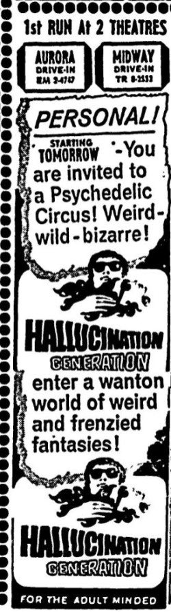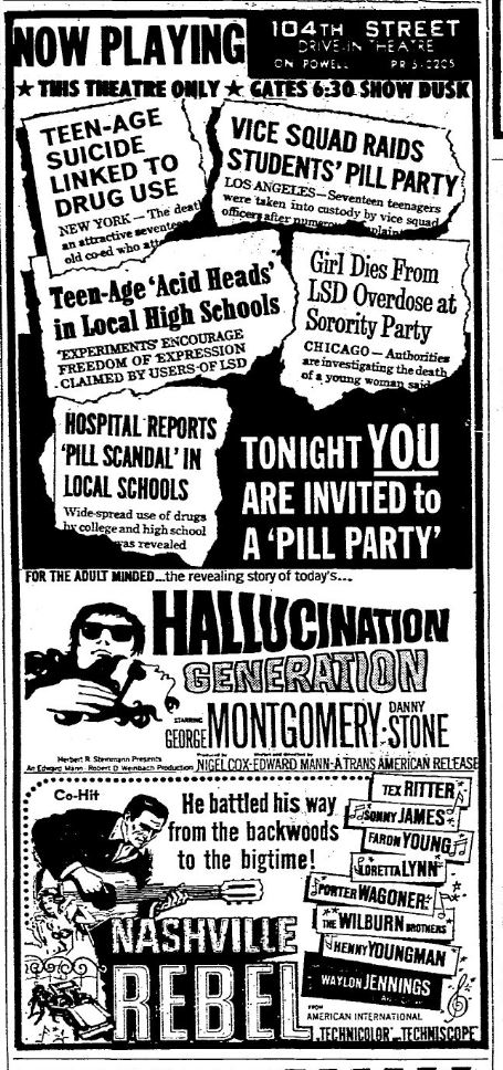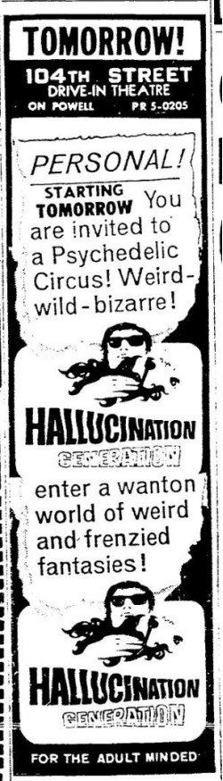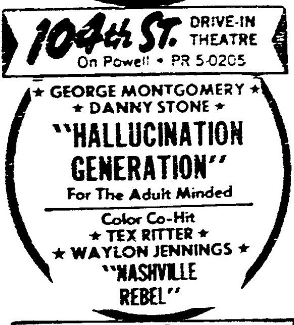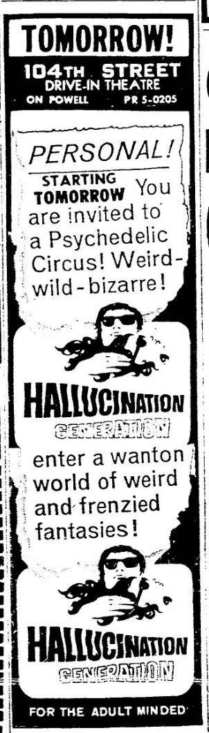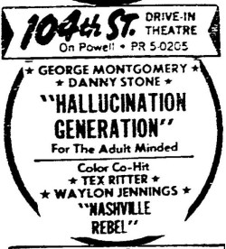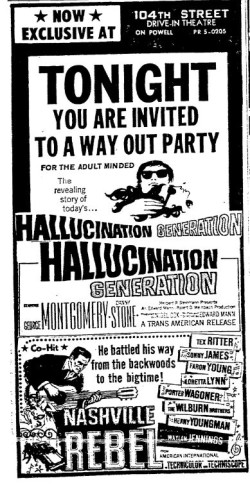 This is a collection of media from the initial runs of "Hallucination Generation" (1964) in the Pacific Northwest. "Nashville Rebel" (1966) was the AIP second feature in Portland while Seattle got "Rage.".