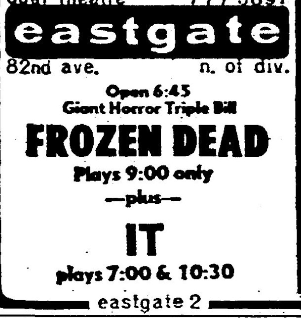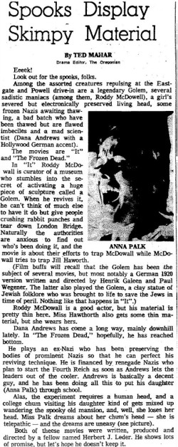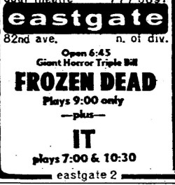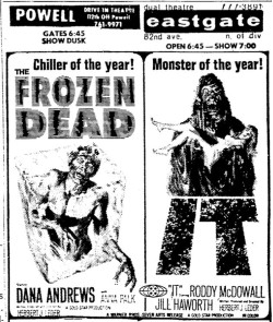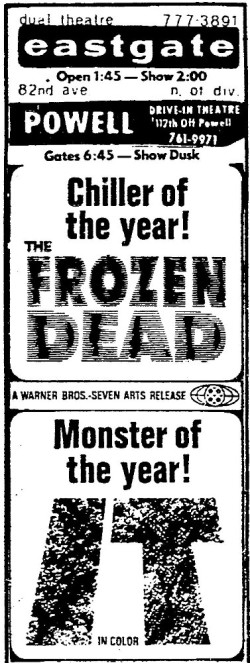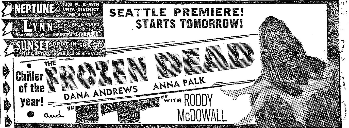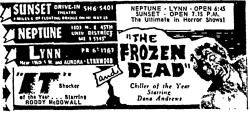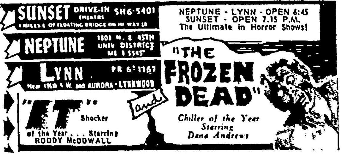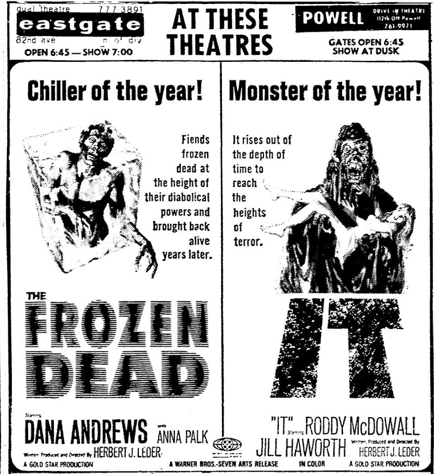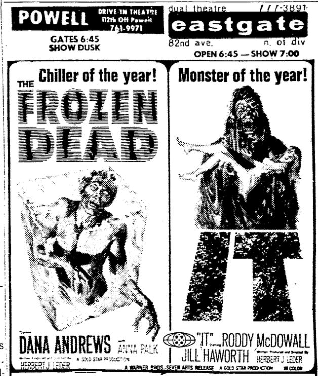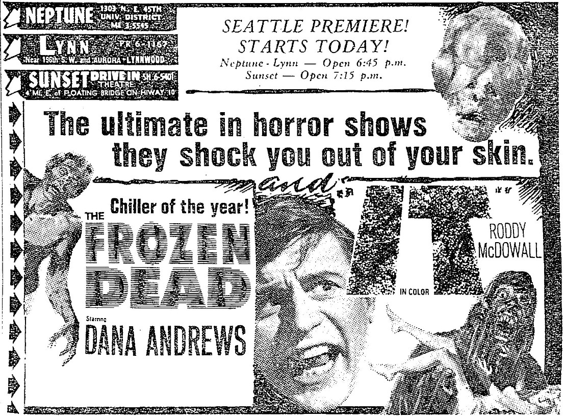 This is a collection of media from the initial runs of "The Frozen Dead" (1966) and "It!" (1967) in the Pacific Northwest. Â