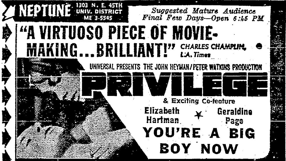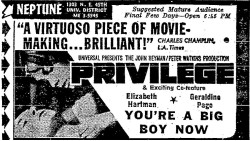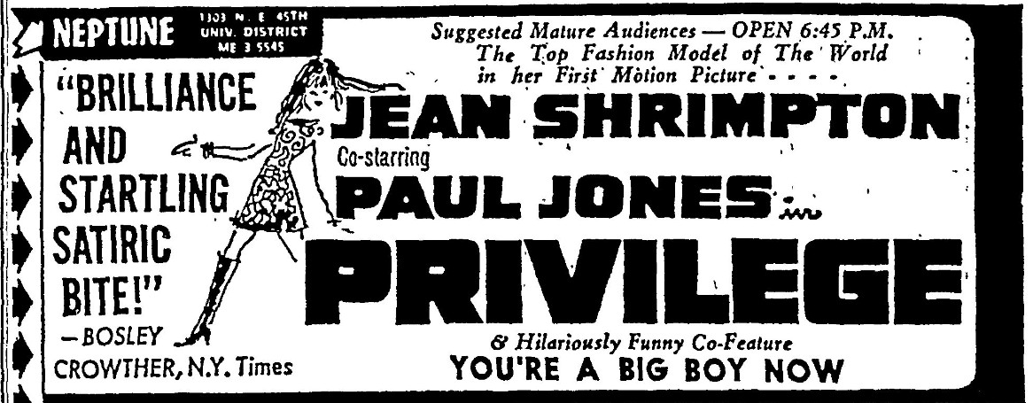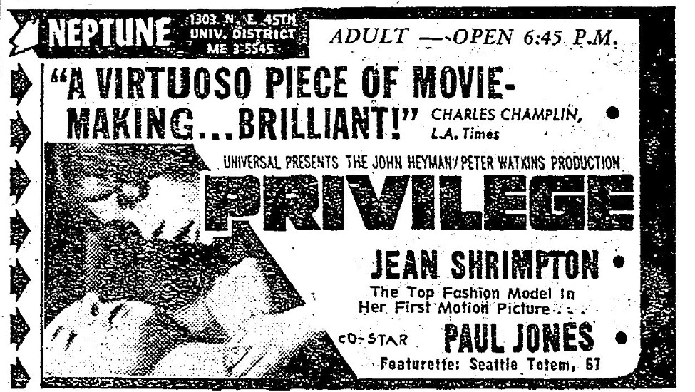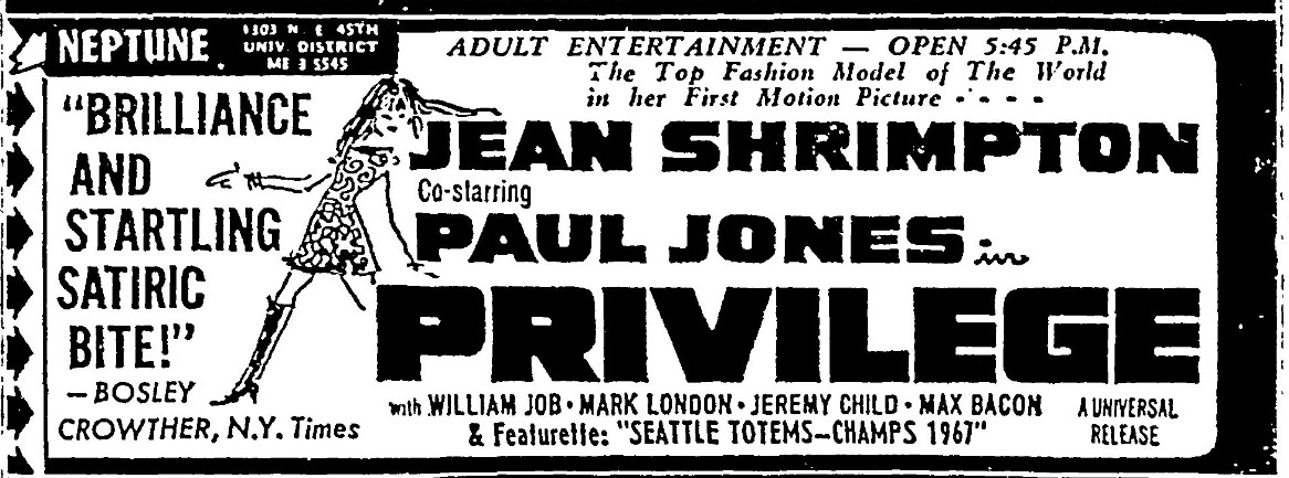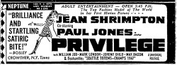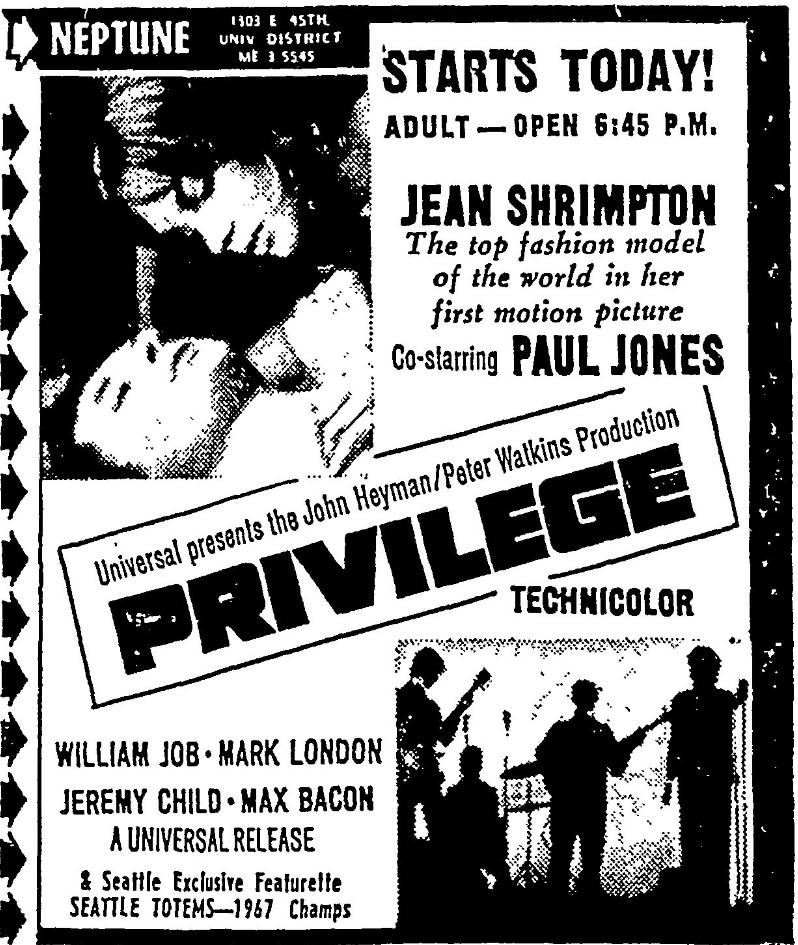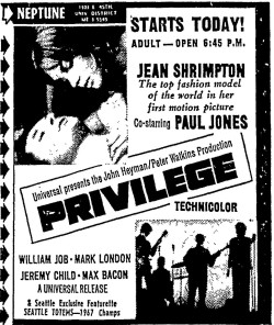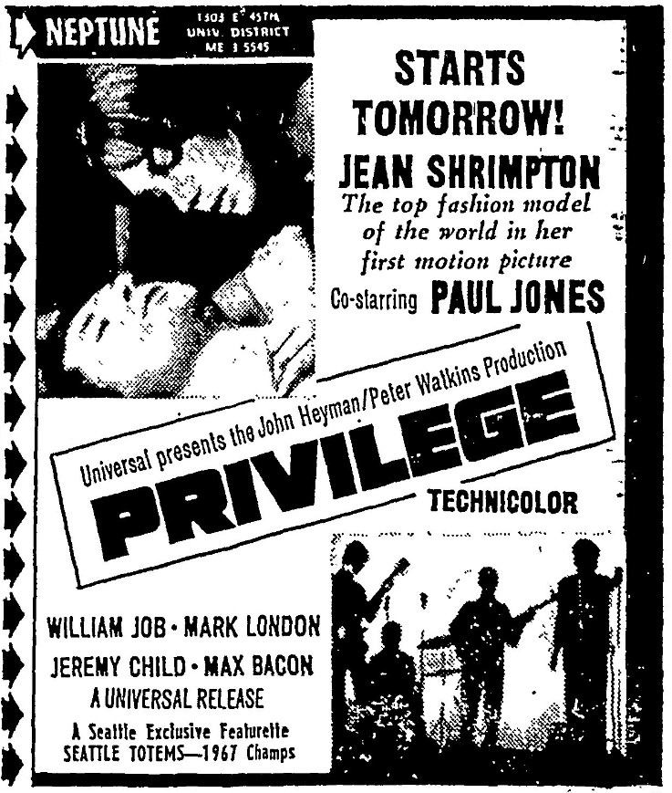 This is a collection of media from the initial runs of "Privilege" (1967) in the Pacific Northwest. The film doesn't appear to have played Portland back in the day.