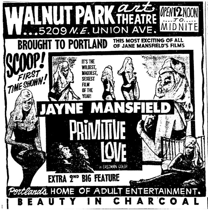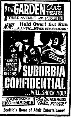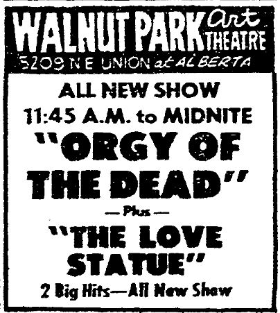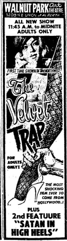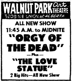 This is a collection of media from various movies, representing the closest things to grindhouse cinemas that Seattle and Portland had. Nudies, roughies, and the occasional art film ruled the day at these places. We'll have several more pages of these for this year.