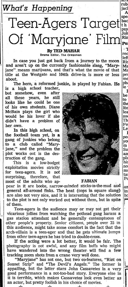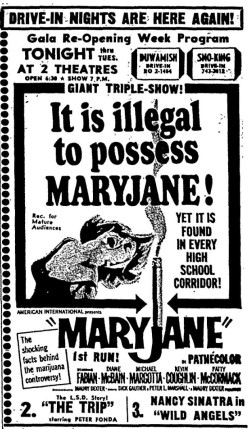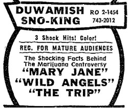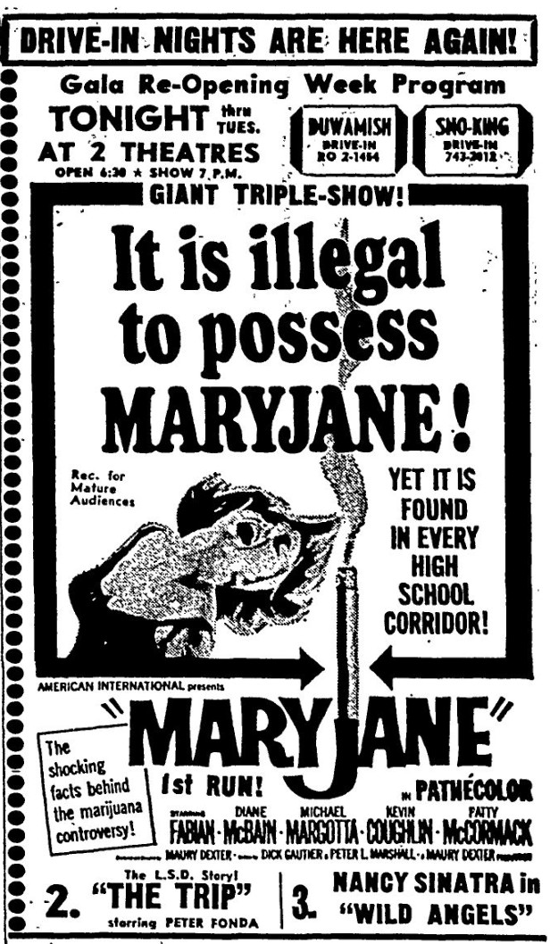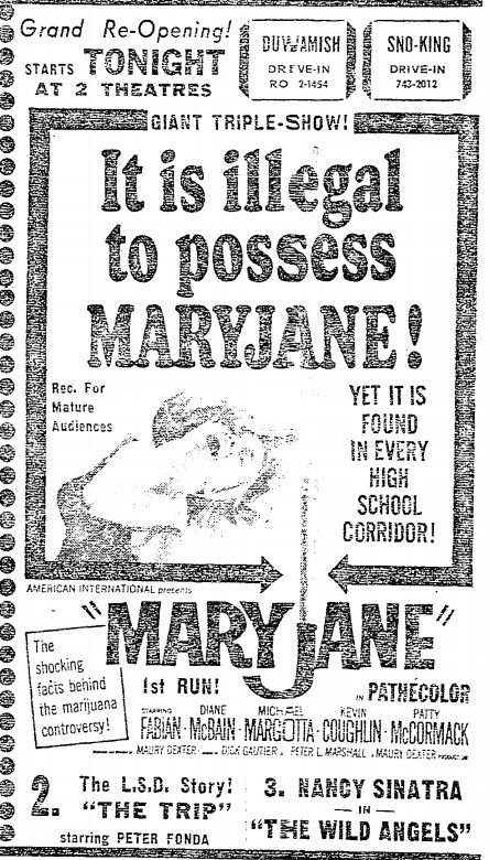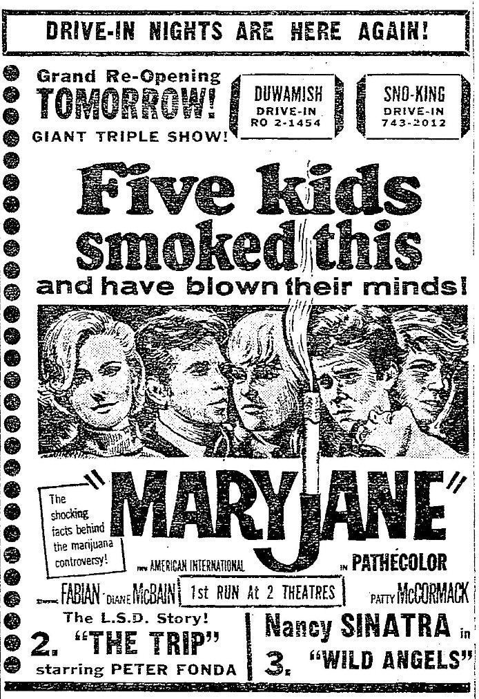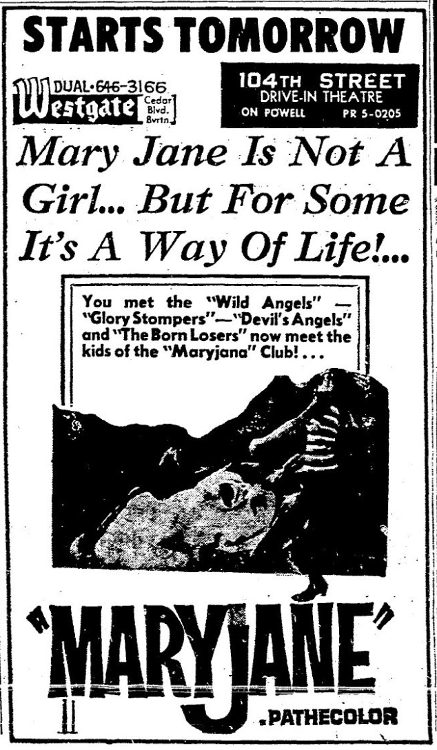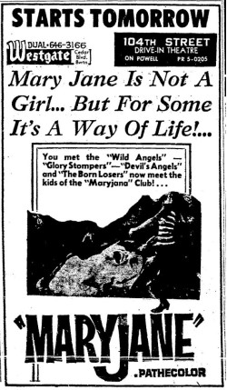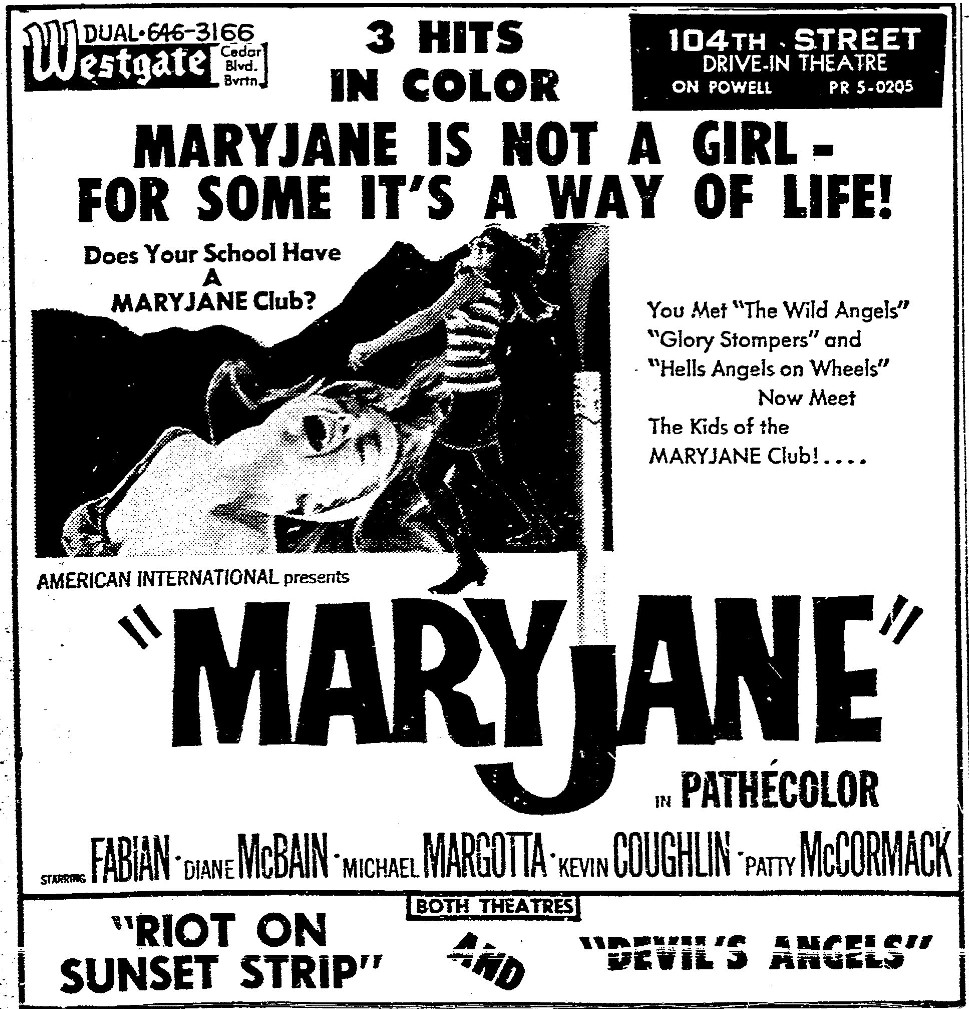 This is a collection of media from the initial runs of "Maryjane" (1968) in the Pacific Northwest. Seattle also got "The Trip" and "Wild Angels" while Portland got "Riot on Sunset Strip" and "Devil's Angels."