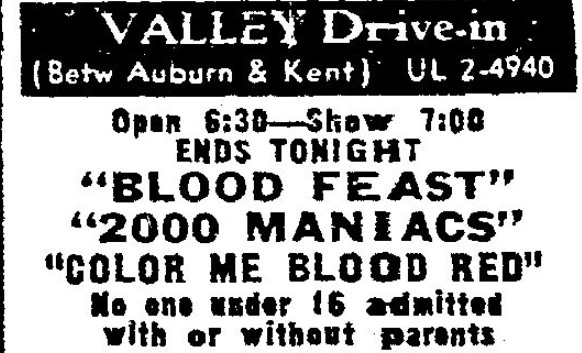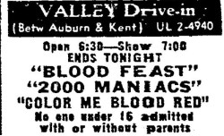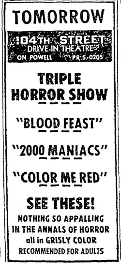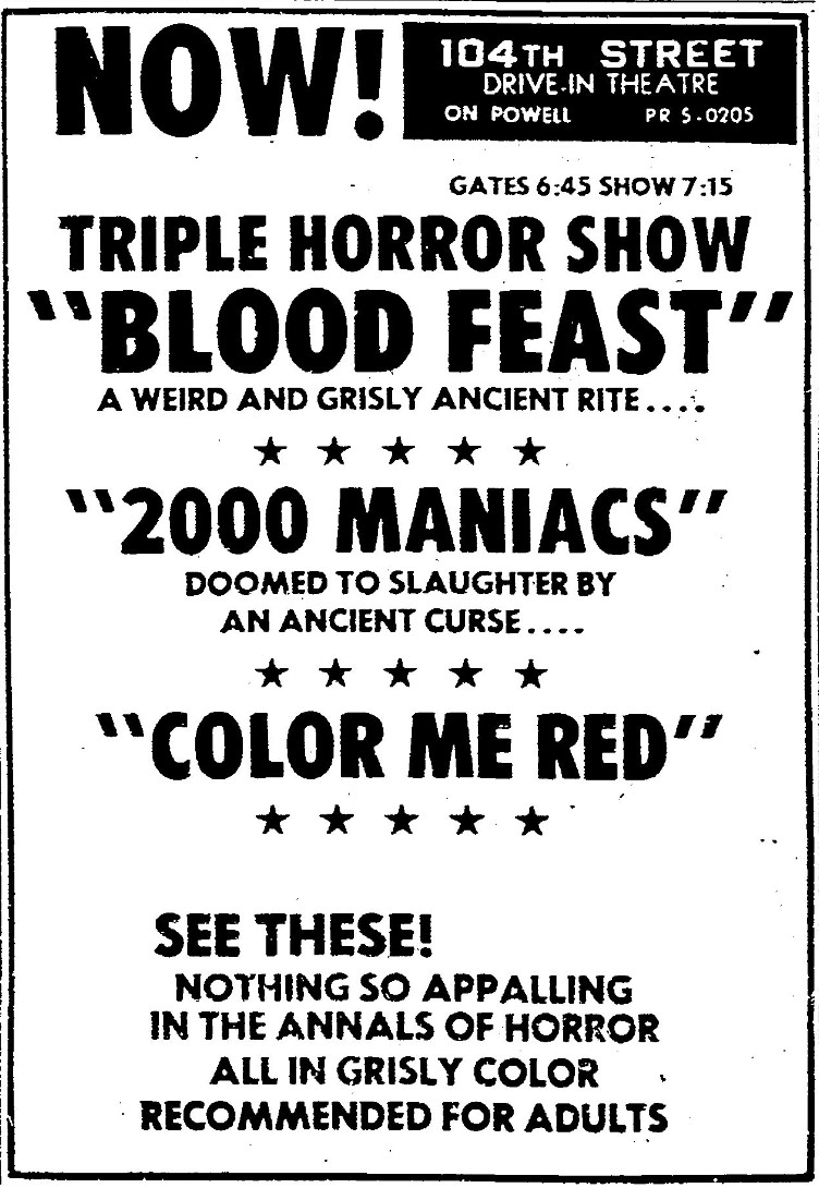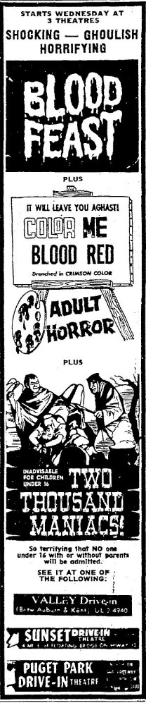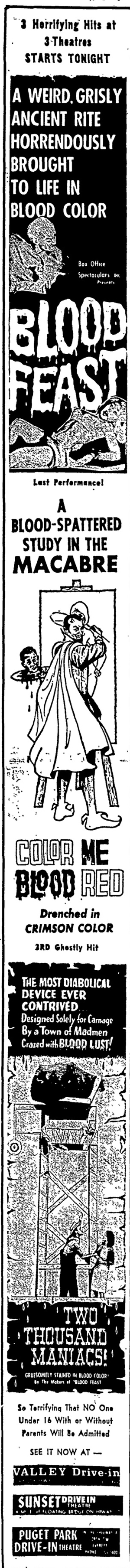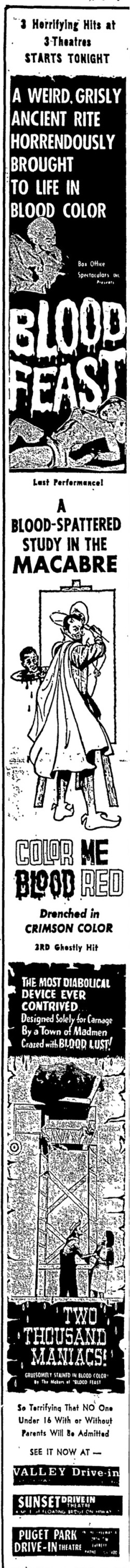 This is a collection of media from the initial runs of H.G. Lewis' "The Blood Trilogy" (1963/1964/1965) in the Pacific Northwest. It took several years, but the good people of Portland and Seattle were finally able to see these all-time exploitation classics. Perhaps there was a little too much "blood" for the Portland papers to run any proper ads.