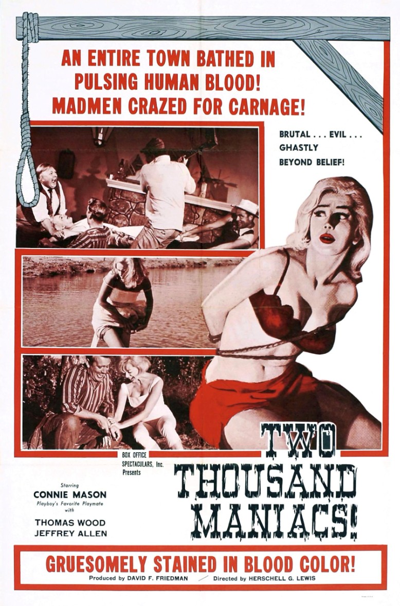 “Two Thousand Maniacs!” (1964) is a feverish blend of Southern Gothic horror and Grand Guignol spectacle, directed by Herschell Gordon Lewis in what would become one of his most notorious and thematically provocative works. While “Blood Feast” introduced audiences to Lewis’s penchant for gore, “Two Thousand Maniacs!” refines that approach into something more narratively coherent and culturally charged, transforming its violence into a grotesque form of historical revenge fantasy.