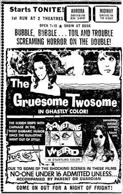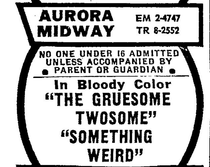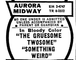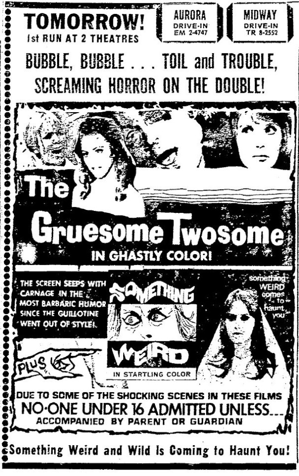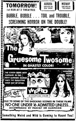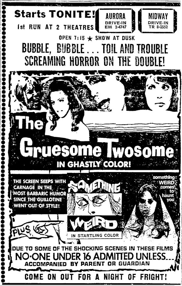 This is a collection of media from the initial runs of "The Gruesome Twosome" and "Something Weird" (1967) in the Pacific Northwest. Looks like these only played in Seattle.
