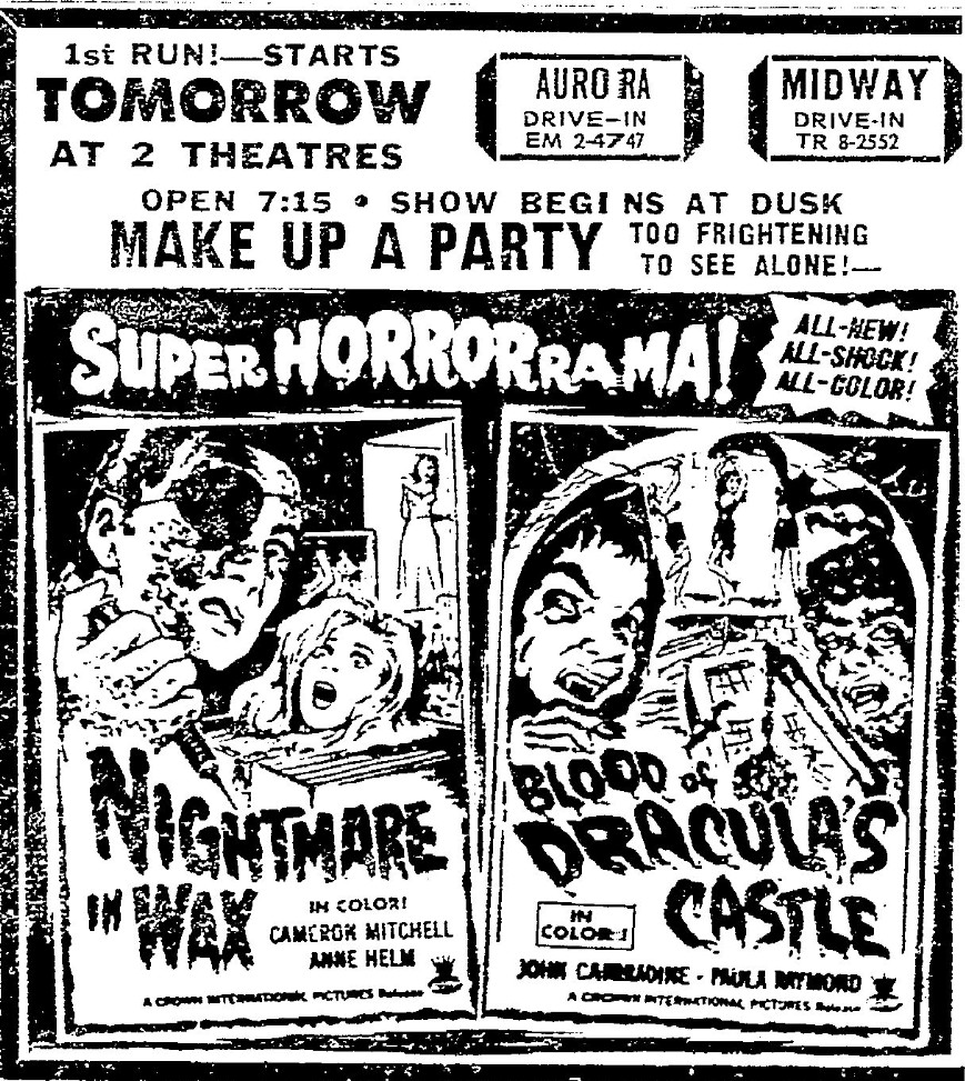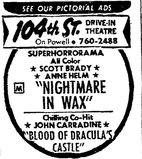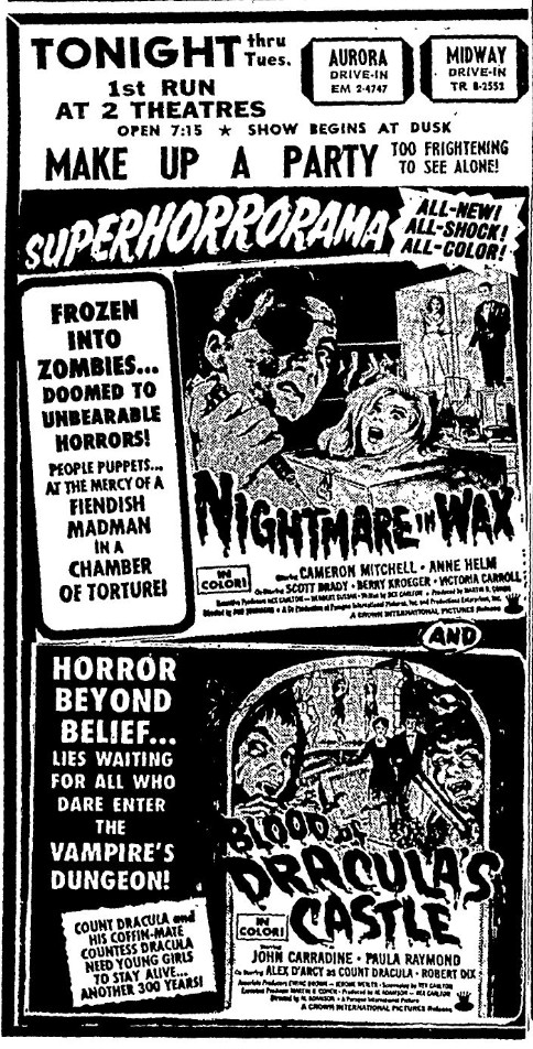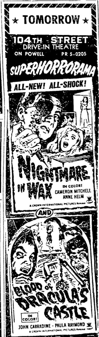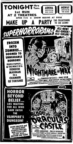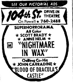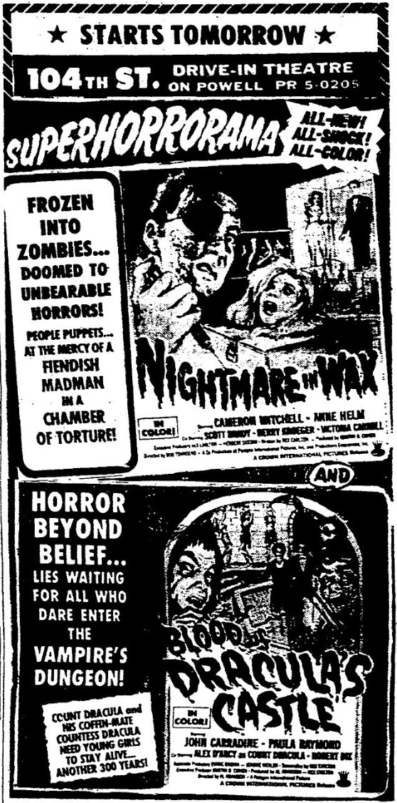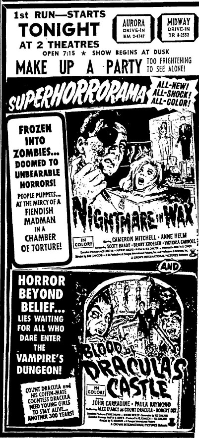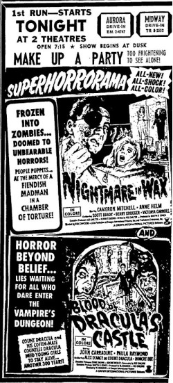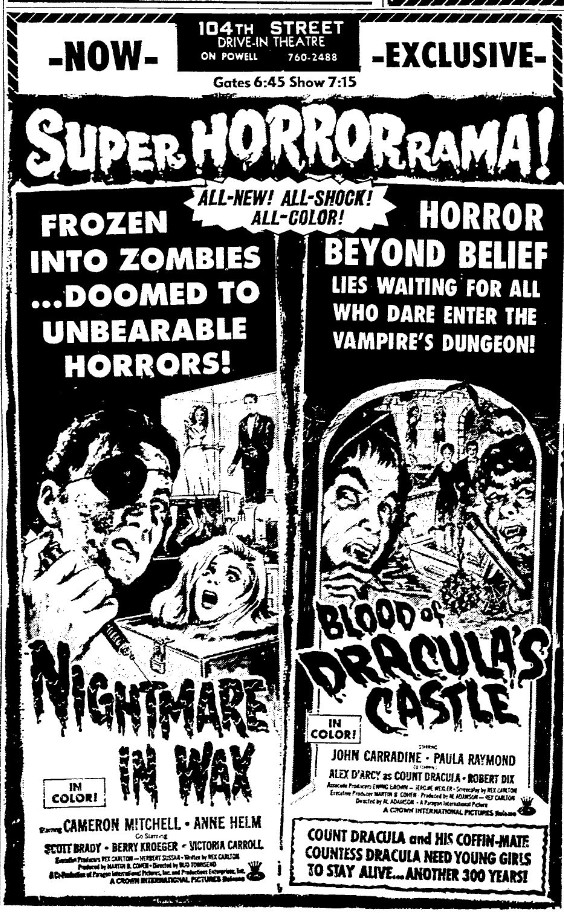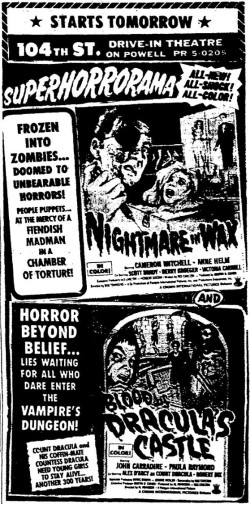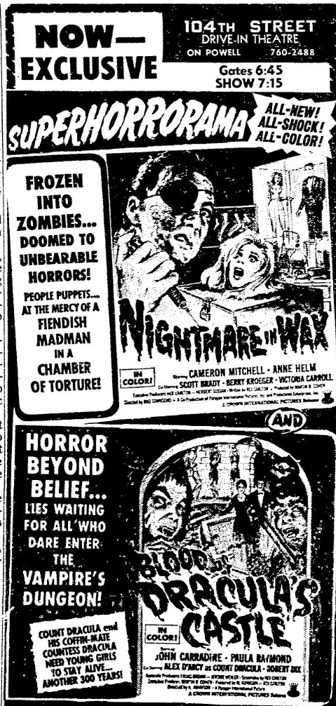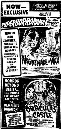 This is a collection of media from the initial runs of "Nightmare in Wax" and "Blood of Dracula's Castle" (both 1969) in the Pacific Northwest.