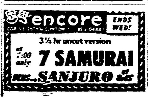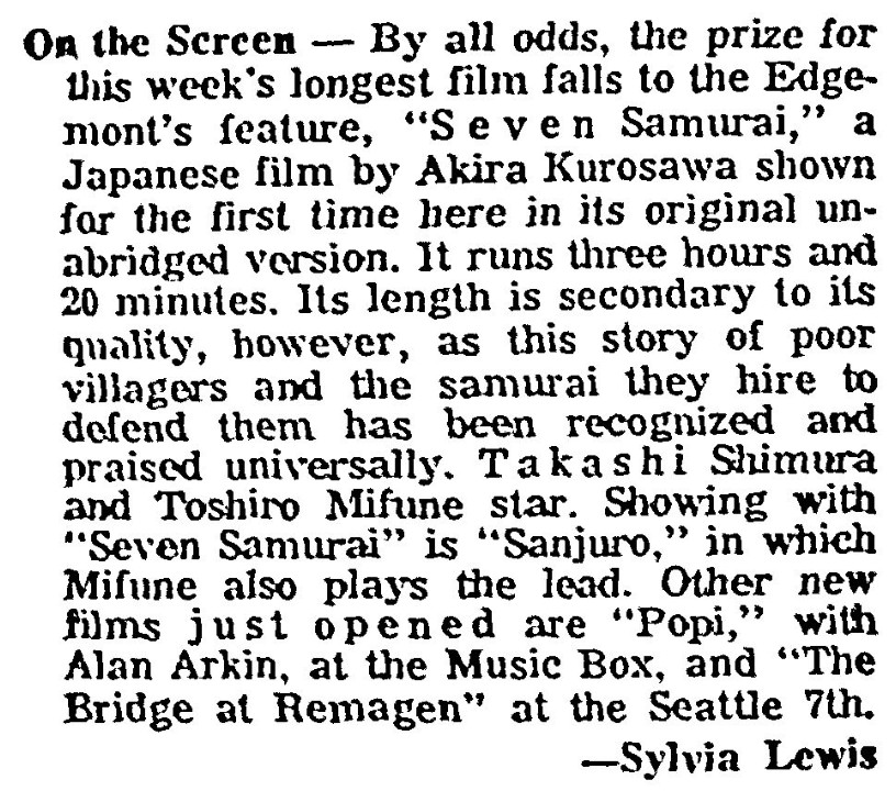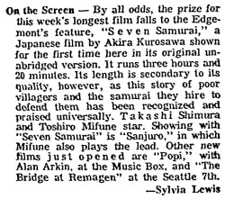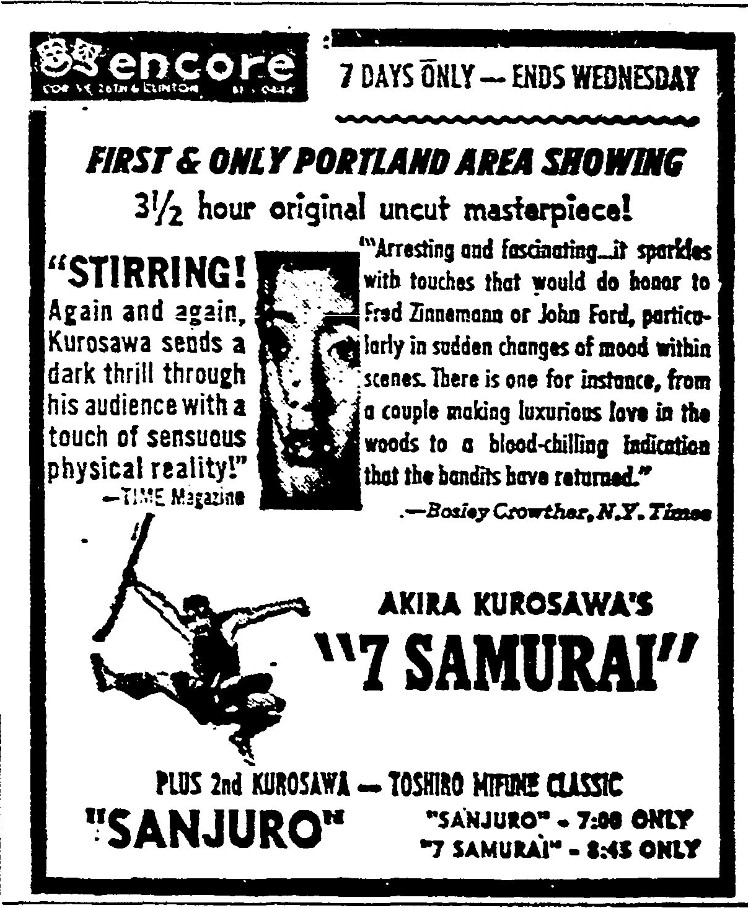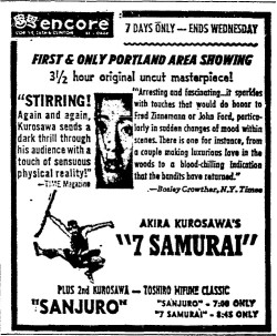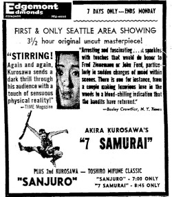 This is a collection of media from the initial runs of the uncut "Seven Samurai" (1954) in the Pacific Northwest.