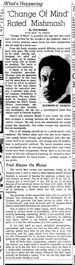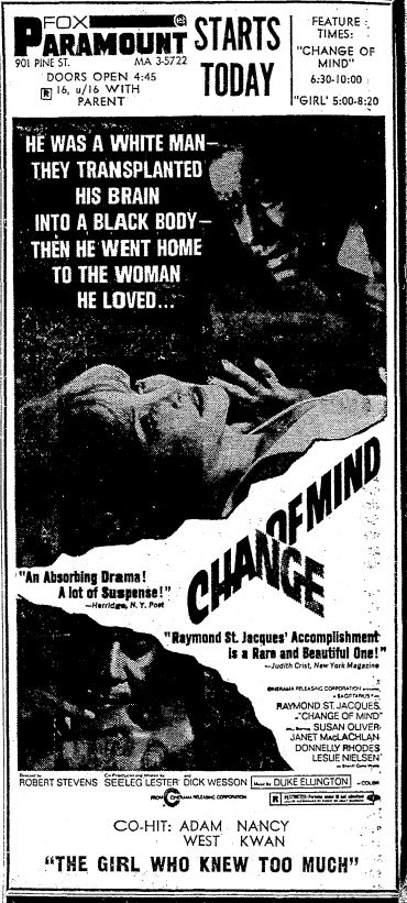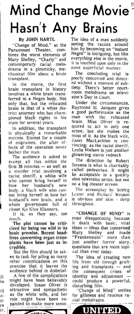 Performances play a crucial role in grounding the film’s ambitious themes. Raymond St. Jacques delivers a restrained and dignified portrayal that anchors the story emotionally, conveying both intellectual clarity and deep personal disorientation. Susan Oliver provides a nuanced counterbalance, embodying the strain placed on personal bonds when identity becomes unstable. Supporting performances, including a notably unsympathetic turn by Leslie Nielsen, help sketch a social landscape shaped by prejudice, skepticism, and institutional rigidity. While the dialogue occasionally veers into didactic territory, the actors’ commitment lends credibility to the film’s moral concerns.